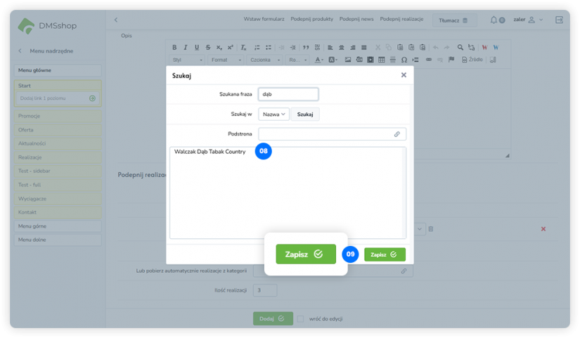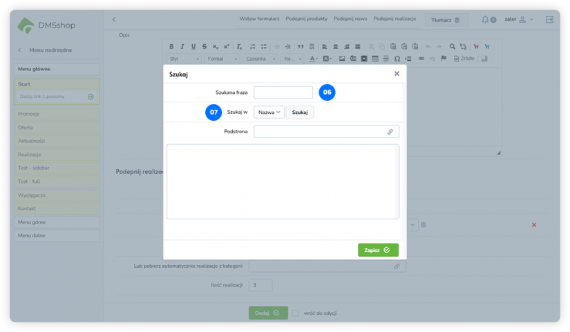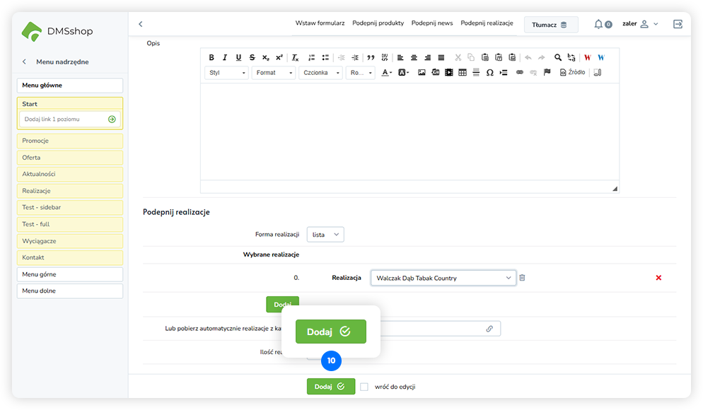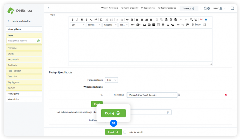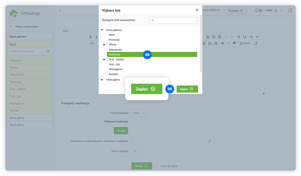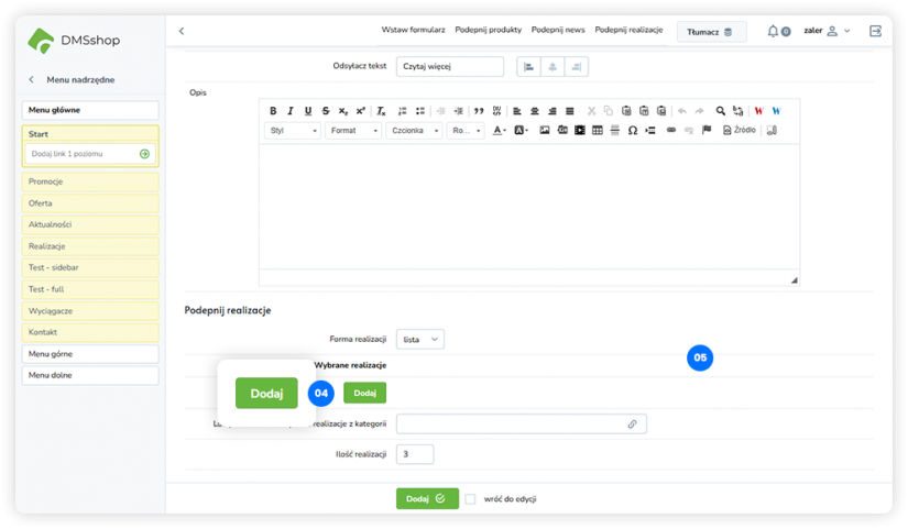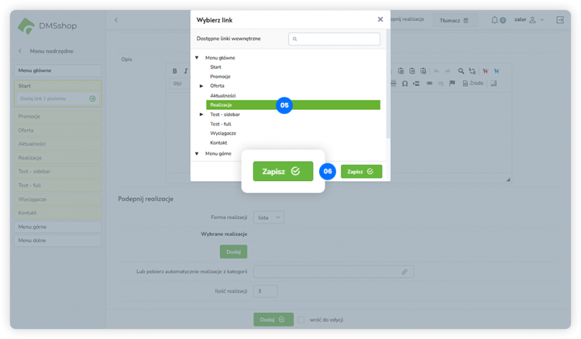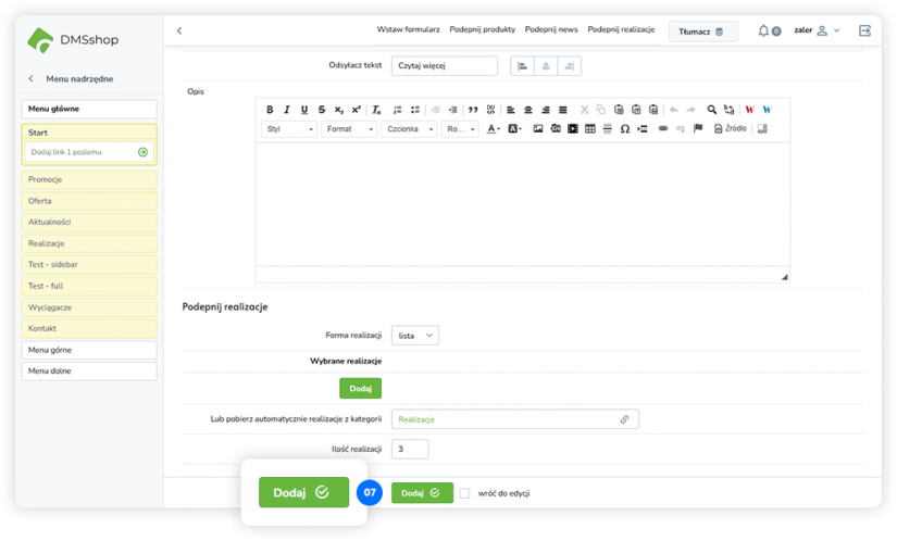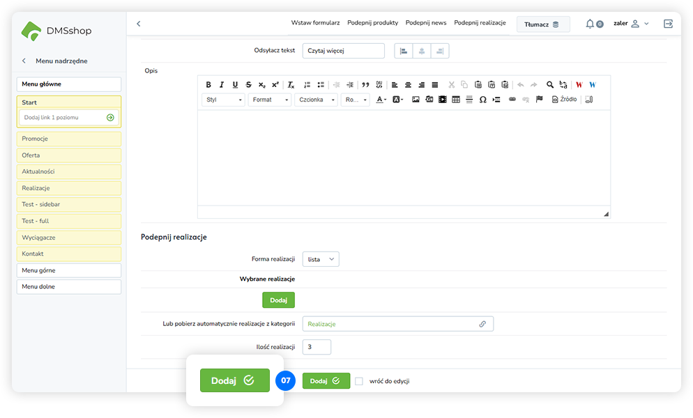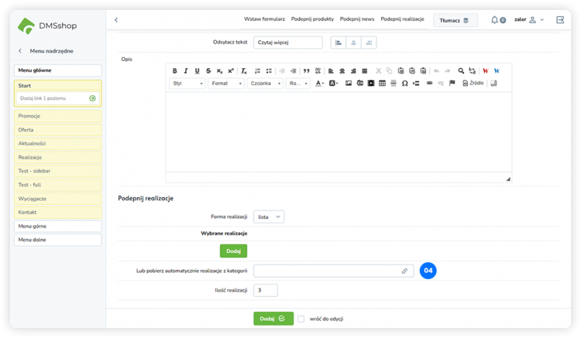 Układ „Podepnij realizacje” w DMSshop pozwala na dynamiczne podłączanie i prezentowanie zrealizowanych projektów lub realizacji firmy na wybranej podstronie.