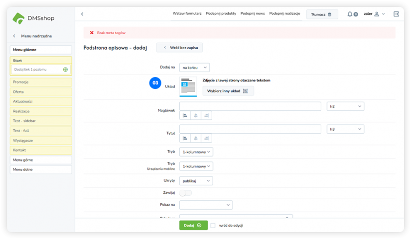 Wybierz podstronę i rozpocznij dodawanie układu.