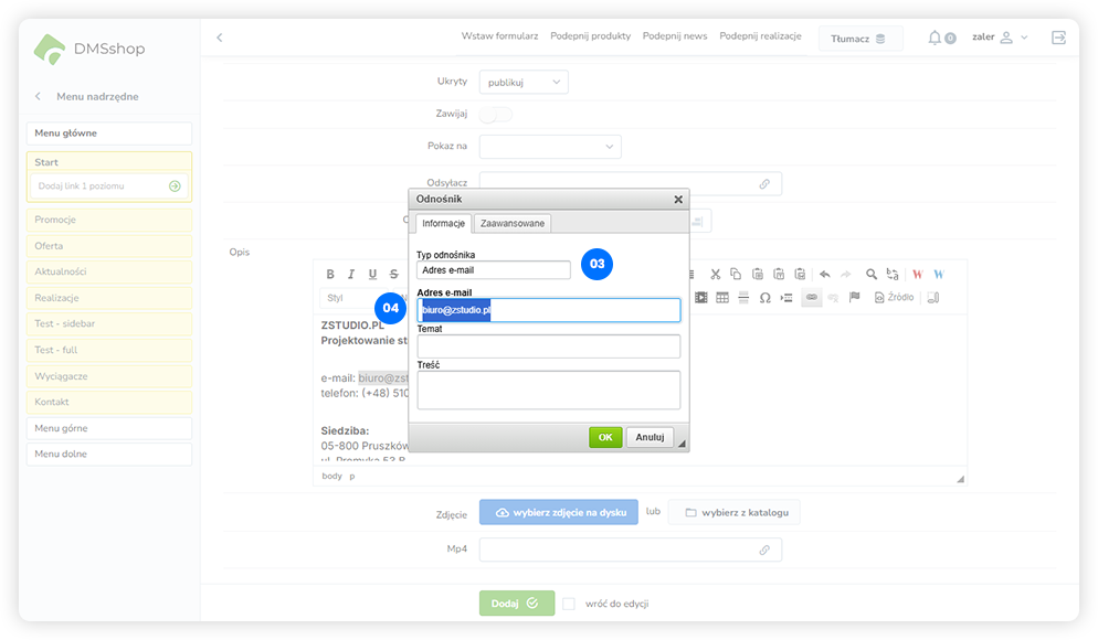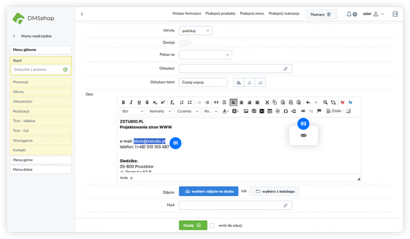 W DMSshop istnieje możliwość utworzenia odnośnika do adresu e-mail, który po kliknięciu automatycznie otworzy domyślny program pocztowy użytkownika.