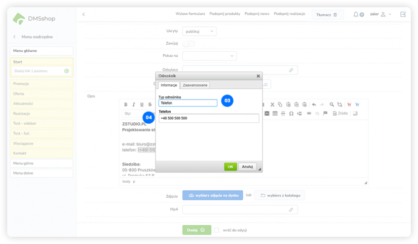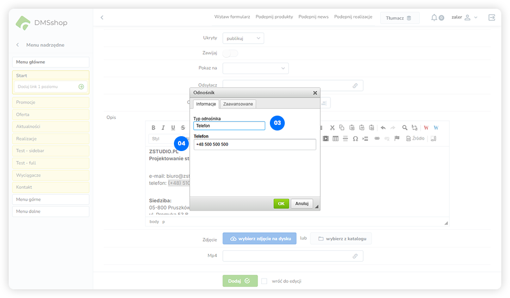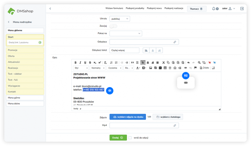 Podobnie jak w przypadku adresów e-mail, w DMSshop można utworzyć odnośnik do numeru telefonu, który na urządzeniach mobilnych umożliwia bezpośrednie nawiązanie połączenia.