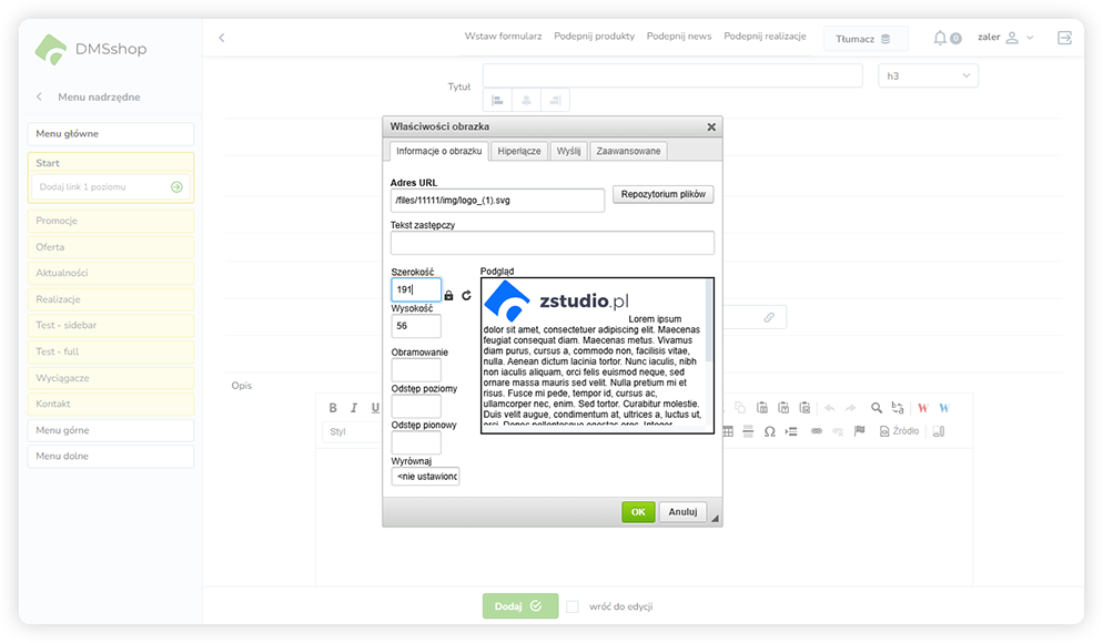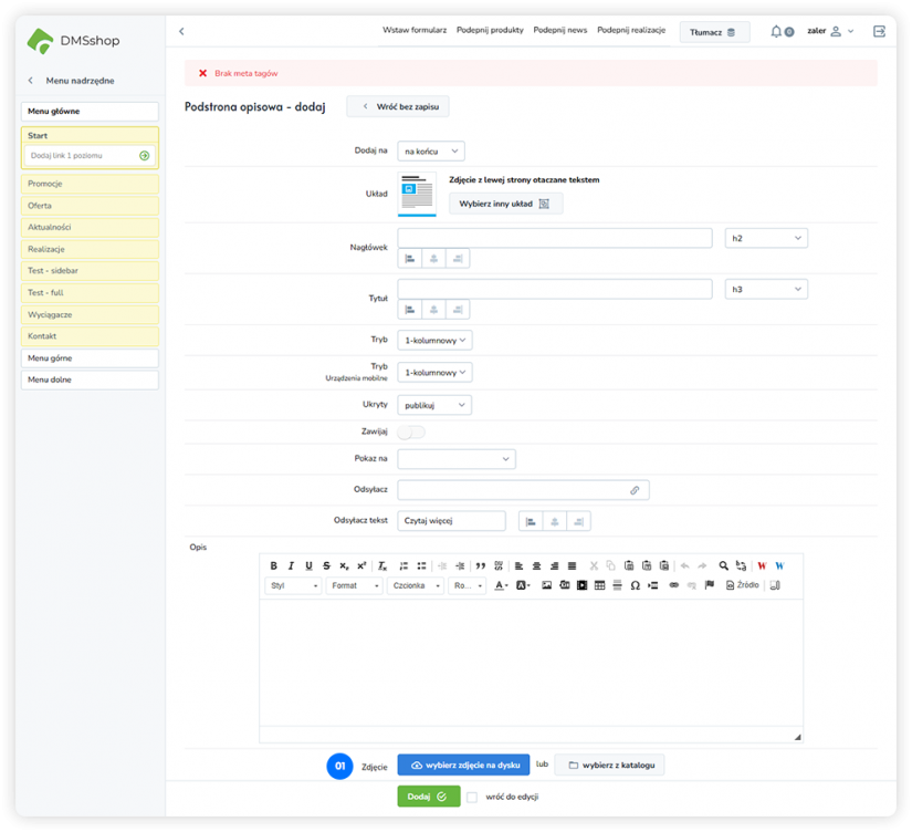 Standardowym i rekomendowanym sposobem dodawania grafik w DMSshop jest skorzystanie z opcji „Wybierz zdjęcie na dysku” dostępnej w formularzu edycji wiersza, z użyciem gotowych układów określających relację tekstu do obrazu. Takie podejście gwarantuje prawidłowe rozmieszczenie grafik oraz spójny wygląd strony.