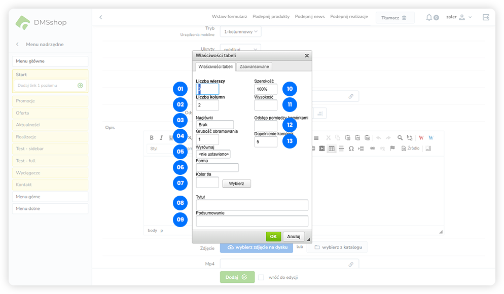 Aby wstawić tabelę w DMSshop, należy skorzystać z ikony