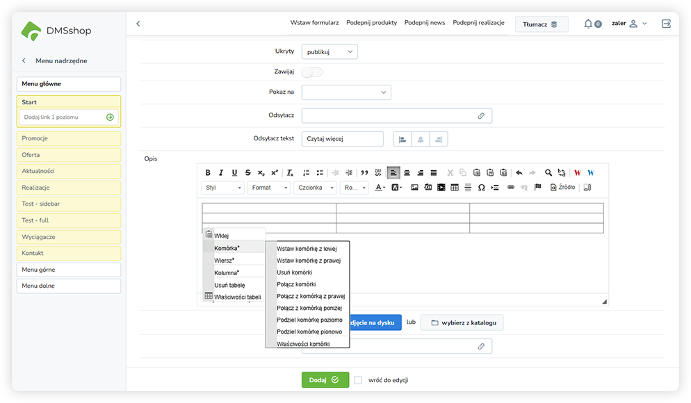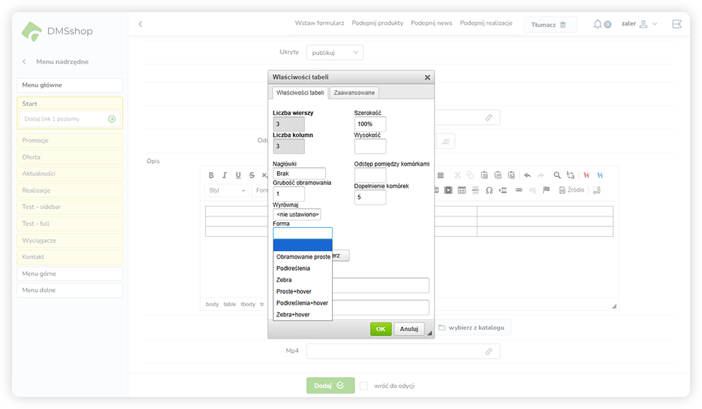 Aby poprawnie dodać i sformatować tabelę wklejoną z programów Word lub Excel w edytorze DMSshop, należy wykonać poniższe kroki: