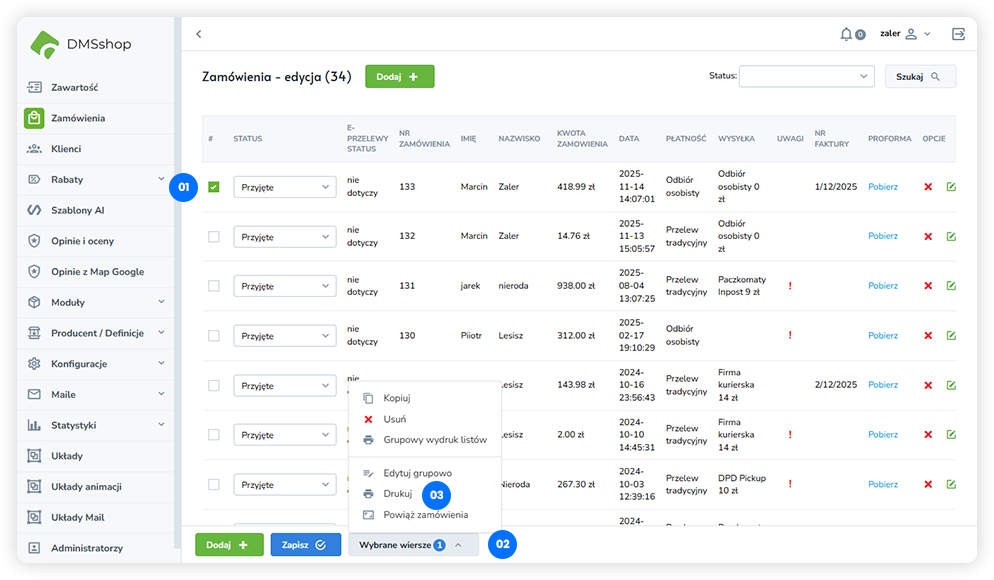 Zaznacz zamówienia, które chcesz wydrukować.