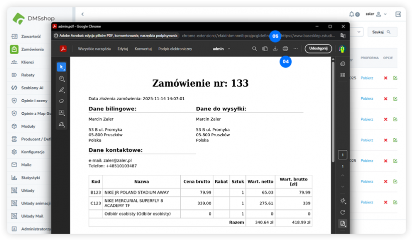 W systemie DMSshop panel wydruków umożliwia generowanie dokumentów PDF dla wybranych zamówień. Wygenerowane dokumenty zawierają pełne informacje dotyczące zamówienia, w tym dane klienta, szczegóły produktów oraz informacje sprzedażowe.