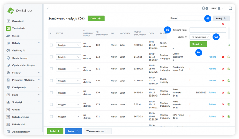 W systemie DMSshop narzędziem do wyszukiwania konkretnych zamówień jest zaawansowana wyszukiwarka, umożliwiająca szybkie odnalezienie zamówień na podstawie wybranych kryteriów.