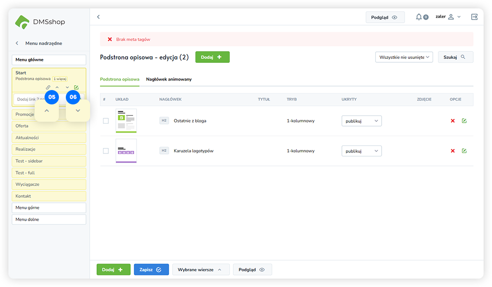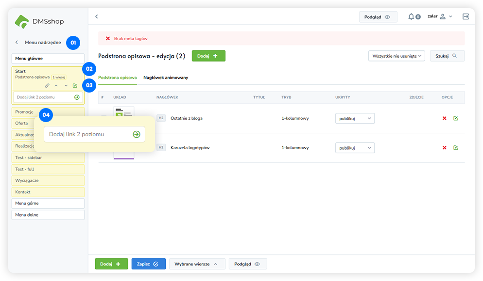 W strukturze menu DMSshop dostępne są funkcje, które ułatwiają zarządzanie zawartością strony oraz jej hierarchią: