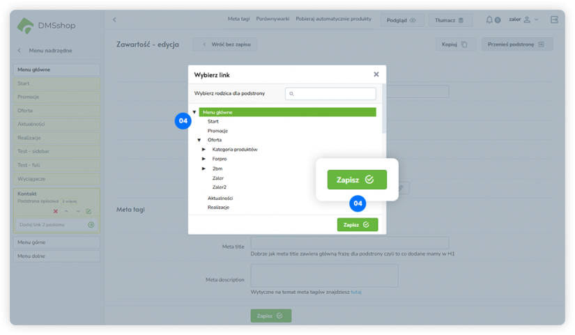 W DMSshop możliwe jest przenoszenie podstron w obrębie struktury menu. Podczas przenoszenia podstrona przenoszona jest razem ze wszystkimi podlinkami, zachowując pełną strukturę oraz treść podstron podrzędnych.