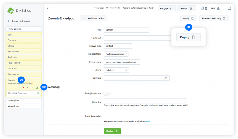 W DMSshop możliwe jest kopiowanie podstron w obrębie struktury menu. Należy pamiętać, że podczas kopiowania przenoszona jest wyłącznie wybrana podstrona — podstrony podrzędne nie są kopiowane.