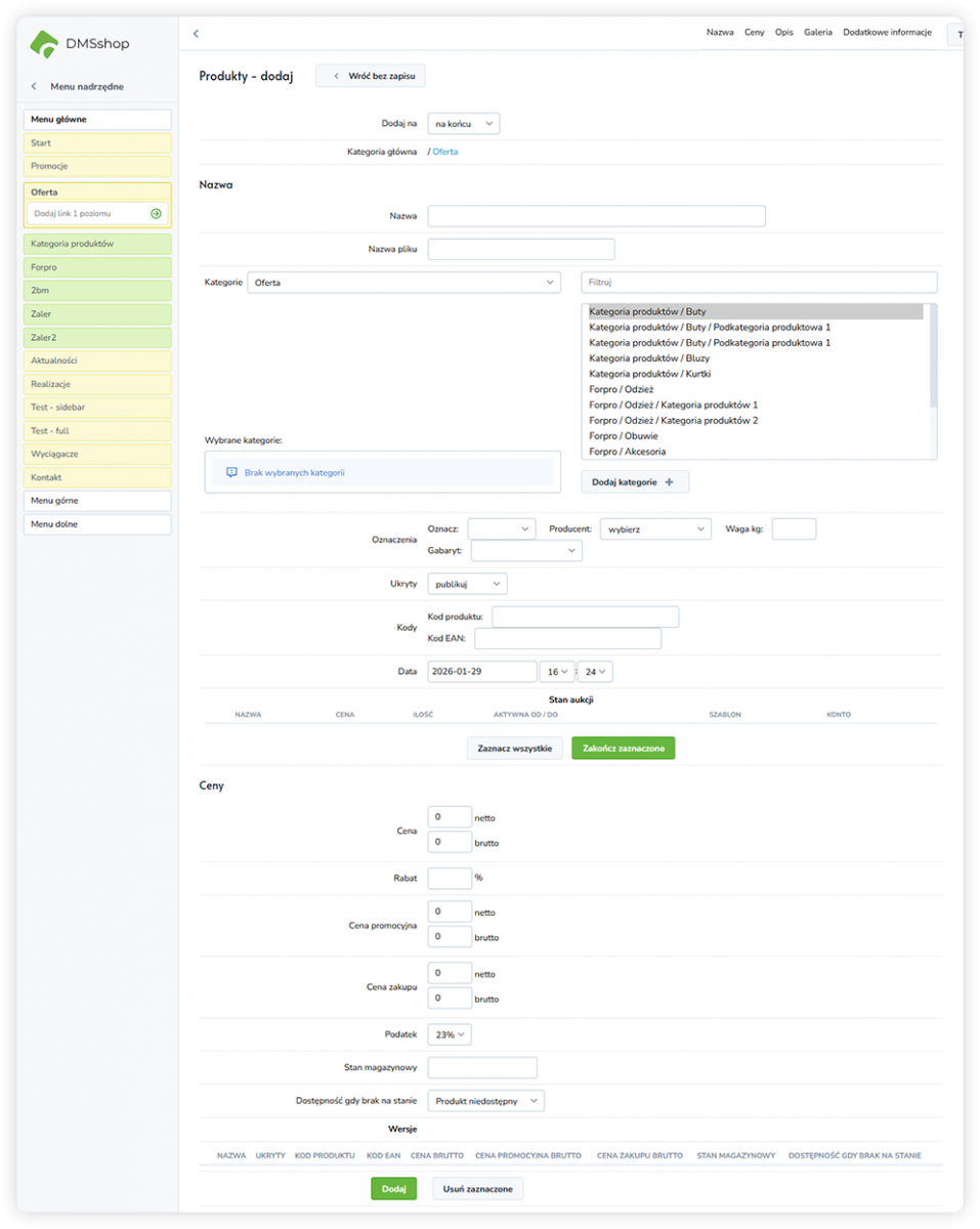 Sekcja służąca do definiowania cen produktu, w tym ceny podstawowej, promocyjnej oraz ceny zakupu. - Stan magazynowy
