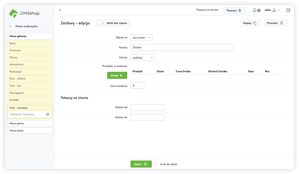 - Ukryty / Publikuj – decyduje, czy zestaw jest widoczny dla klientów, czy dostępny tylko w panelu administracyjnym.