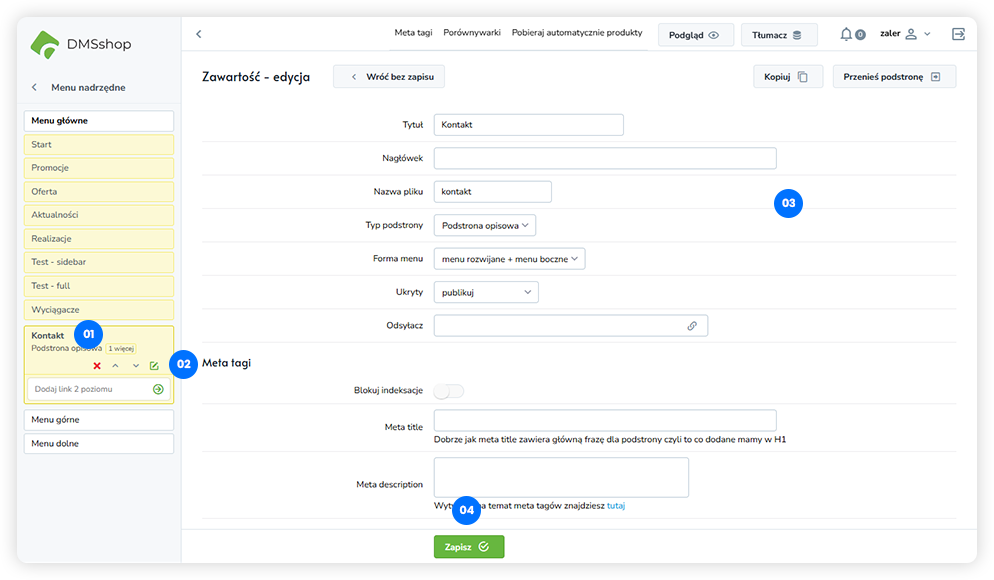 Powyższy widok prezentuje schematyczny formularz edycji właściwości podstrony. W dalszej części opisano szczegółowo znaczenie oraz sposób działania poszczególnych pól dostępnych w DMSshop.